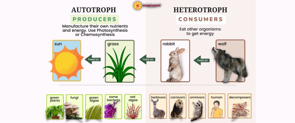 Plants have the capacity for self-production of food. Through the process of photosynthesis, plants convert carbon dioxide, water, and sunlight into carbohydrates and oxygen, allowing them to sustain themselves. The carbohydrates produced are used for their own growth and reproduction. Thus, plants are called ‘autotrophic’ organisms (manufacturing their own food).