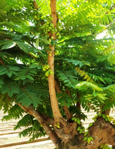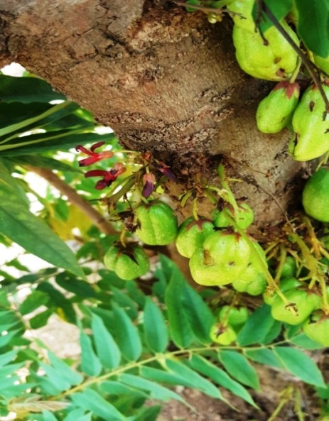 A. bilimbi is a perennial tree up to 5–10 m in height; has a short trunk soon dividing into a number of upright branches. Leaves 30–60 cm long, mainly clustered at the branch tips, alternate, imparipinnate with 11–37 alternate or sub opposite leaflets; leaflet ovate or oblong, with rounded base and pointed tip, downy, medium-green on the upper surface, pale on the underside, 2-10 cm long, 1.2–1.25 cm wide. Inflorescence borne in small, hairy panicles emerging directly from the trunk and oldest, thickest branches and some twigs. Flowers small, fragrant; petals 5, yellowish-green or purplish marked with dark-purple, 10–30 mm long. Fruits ellipsoid, obovoid or nearly cylindrical, faintly 5-sided, 4–10 cm long; capped by a thin, star-shaped calyx at the stem-end and tipped with 5 hair-like floral remnants at the apex; fruit is crisp when unripe, turns from bright-green to yellowish green when ripe, ivory or nearly white when matured and falls to the ground; outer skin is glossy, very thin, soft and tender, and the flesh green, jelly-like, juicy and extremely acid. Seeds flattened, smooth, disc-like seeds, about 6 mm length, few (perhaps 6 or 7) and brown in colour [ 4 , 5 , 6 , 7 ].