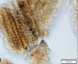 Figure 2 : Microscopic characters of A. bilimbi dried fruit powder of 0.355 mm size. (a) Simple, unicellular trichome (magnification 40x); (b) oil cells (arrow) (magnification 40x); (c) druse calcium oxalate crystals (arrow) (magnification 40x); (d) druse calcium oxalate crystals, under polarised filter (magnification 40x); (e) solitary calcium oxalate crystals (arrow) (magnification 40x); (f) solitary calcium oxalate crystals, under polarised filter (magnification 40x); (g) spiral vessel (arrow) (magnification 40x). [Scale bars: a – h = 20 µm].