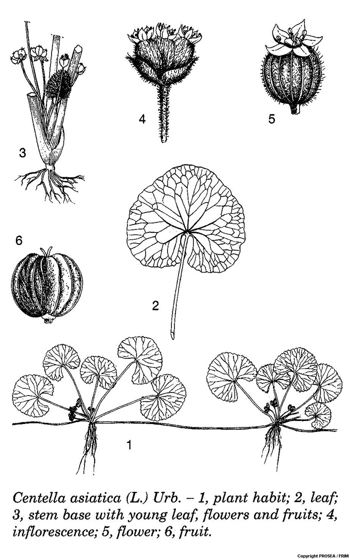 - Hargono D, Lastari P, Astuti Y, van den Bergh MH. Centella asiatica (L.) Urb. In: de Padua LS, Bunyapraphatsara N, Lemmens RHMJ, editors. Plant Resources of South-East Asia No. 12(1): Medicinal and poisonous plants 1. Leiden, Netherlands: Backhuys Publishers, 1999; p. 190-194.