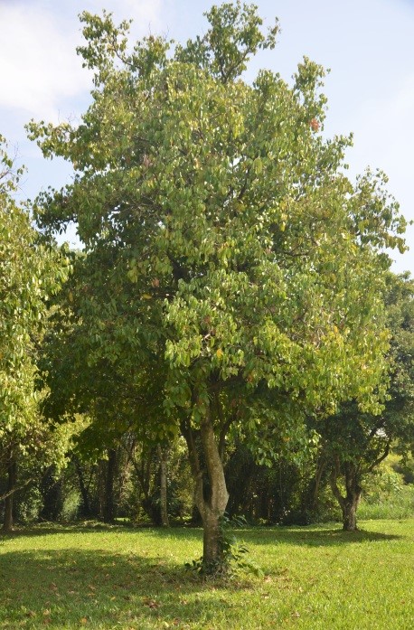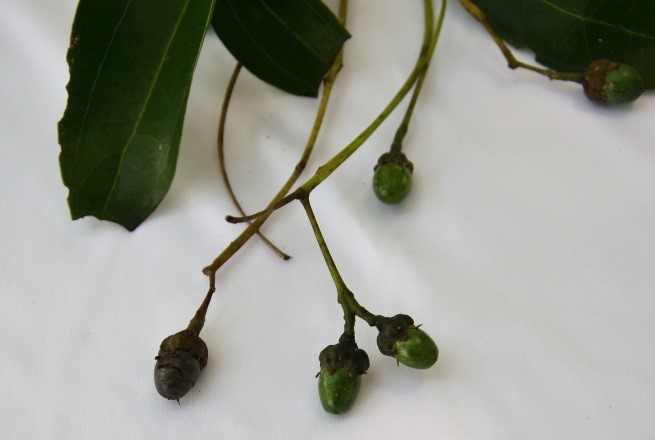 C. verum is a evergreen tree grows up to 18 m tall. Trunk is stout, low-branching, up to 60 cm in diameter; buttresses 60 cm tall, 70 cm deep, thin, light pinkish-brown; stem bark about 10 mm thick, strongly aromatic; the stem bark on young shoots is smooth and pale brown, on mature branches and stems rough, dark brown or brownish-grey; wood of mature trees varies from light brownish-grey to grey or yellowish-brown, without markings, more or less lustrous and faintly scented. Leaves opposite, somewhat variable in form and size, strongly aromatic; petiole 1-2 cm long, grooved on upper surface; blade ovate to elliptical, 5-25 cm x 3-10 cm, conspicously 3-veined, or 5-veined, base rounded, apex acuminate, glabrous, coriaceous, shiny dark green. Inflorescence consisting of lax axillary or terminal panicles up to 10 cm long or longer; peduncle creamy white, softly hairy, 5-7 cm long. Flowers small, 3 mm in diameter, with foetid smell, pale yellow, subtended by small ovate hairy bract; perianth 8 mm long, silky hairy, with short campanulate tube and 6 persistent tepals about 3 mm long; fertile stamens 9, in 3 whorls, with 2 small glands at the base of the stamens of the third whorl; a fourth innermost whorl consists of 3 staminodes; filaments hairy, stout; anthers 4- or 2-celled; ovary superior, 1-celled, with a single ovule, style short. Fruit 1-seeded berry, ellipsoidal to ovoid, 1-2 cm long, black when ripe, surrounded by the enlarged perianth at the base. Roots moderately deep and extensive; seedling root growth is initially rapid, with formation of a well-developed taproot followed by numerous spreading laterals [ 5 ].