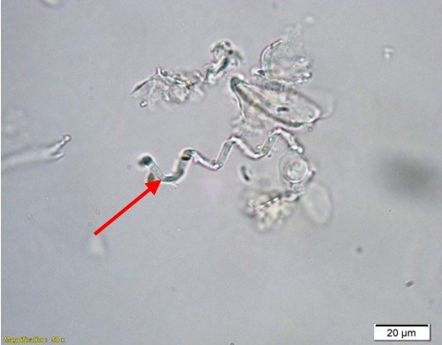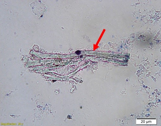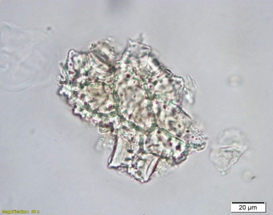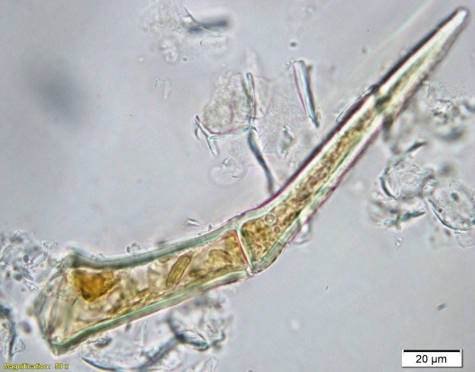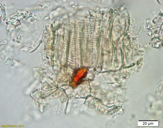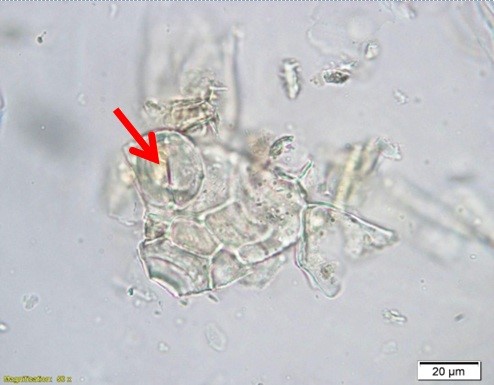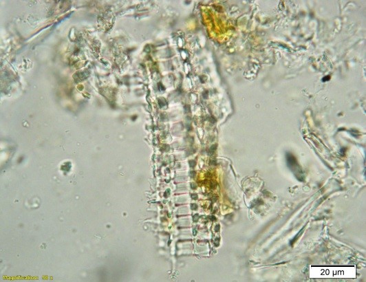 Powdered material consists of epidermal cells; fragments of parenchyma, paracytic stomata found attached to epidermal cells; brachysclereid found isolated; fibres; group of spiral and annular vessels; simple multicellular trichome; mucilage cell.