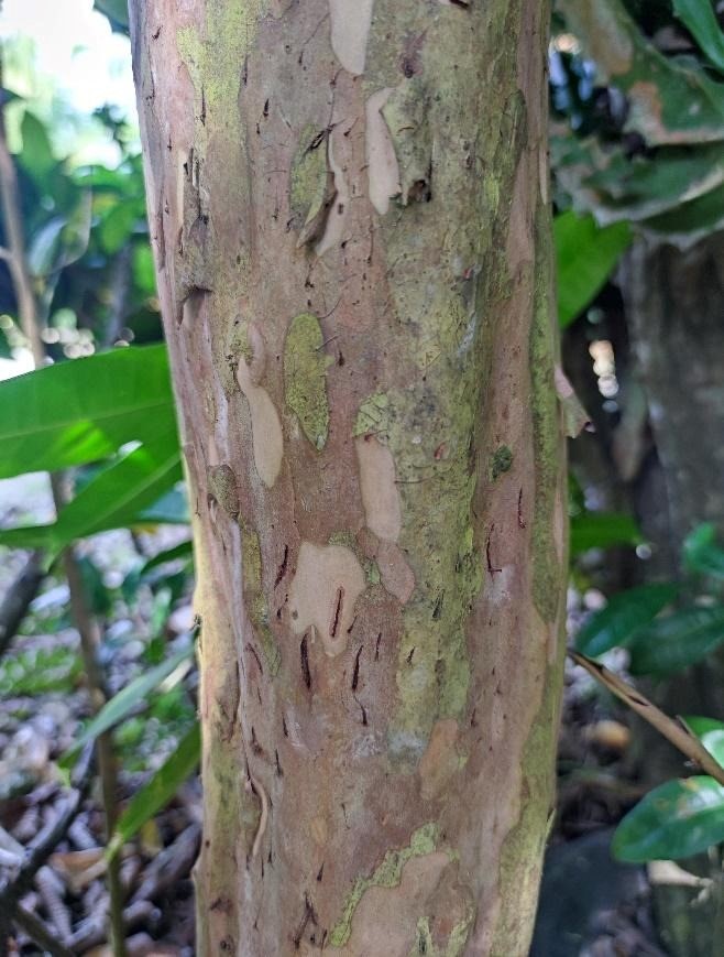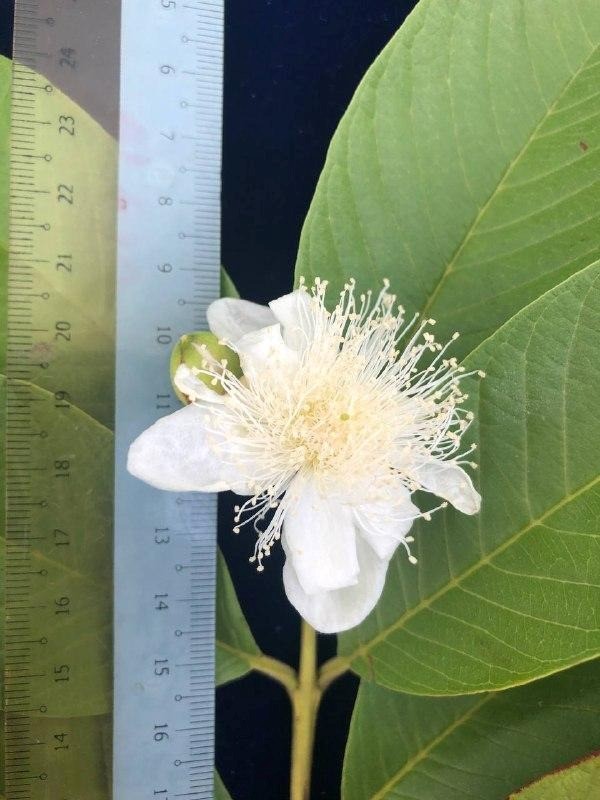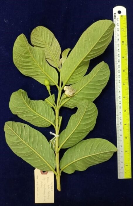 P. guajava is a shallow-rooted shrub or small tree, up to 10–13 m tall, branching from the base and often producing suckers. Bark is smooth, green to red-brown, peeling off in thin flakes. Young twigs 4–angled and ridged, pubescent. Leaves are simple, opposite, glandular; Leaf blades are elliptical to oblong, 5–15 cm x 3–7 cm, glabrous above, finely pubescent beneath, secondary veins 12–15 on each side of midvein and usually impressed, reticulate veins obvious, base rounded, apex acute to obtuse; Petioles 3–10 mm long. Inflorescences axillary fascicles, each with several staminate flowers and 1 or 2 pistillate flowers. Flowers are solitary or in 2–3-flowered cymes, axillary, approximately 3 cm in diameter; calyx 4–6-lobed, 1–1.5 cm long, irregular, persistent; petals 4–5, white, 1–2 cm long; stamens numerous, 1–2 cm long; ovary 4–5-locular; style 1.5–2 cm long, stigma capitate. Fruits are a berry, globose, ovoid or pyriform, 4–12 cm long, surmounted by the calyx lobes; exocarp green to yellow. Pulp or mesocarp fleshy, white to yellow, with stone cells, sour to sweet, and aromatic. Seeds are usually numerous, embedded in pulp, yellowish, bony, reniform, 3–5 mm long [3, 4].