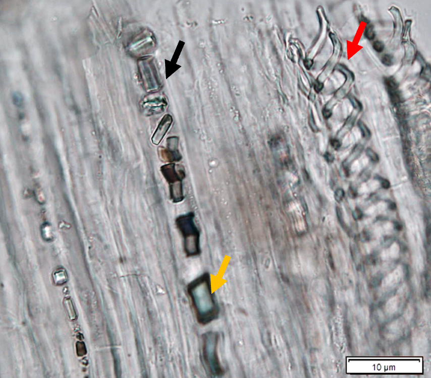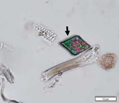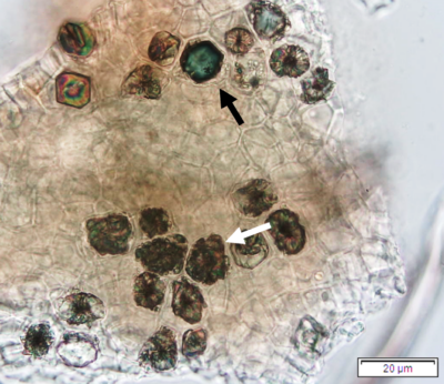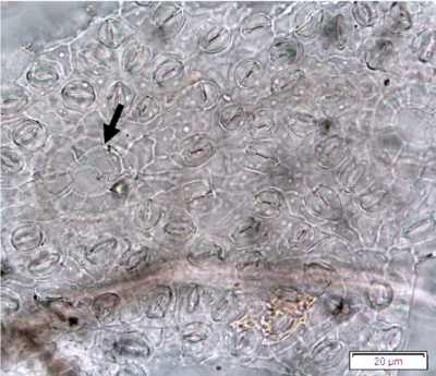Powdered leaves material consists of adaxial epidermal cells with straight anticlinal walls and abaxial with wavy anticlinal walls, hypostomatic and paracytic stomata; long, simple, unicellular and multicellular with glandular head trichomes and abundant of oil globules in the epidermis cells.  Other features observed include the presence of prismatic solitary (rhombus, hexagonal, rectangular, and rod shapes) and druses calcium oxalate crystals; spiral, pitted, and annular vessels; and fibre fragments [7, 8].