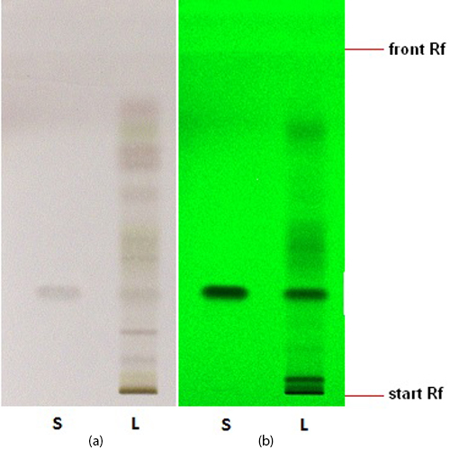 Figure 3 : TLC chromatogram of gallic acid (S), ethanol extract of Pandanus amaryllifolius dried leaves powder (L) observed under (a) visible light after derivatization and (b) UV at 254 nm before derivatization.